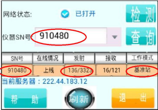 打开软件,在仪器SN号后的框中输入要查询仪器的SN号,点击查询,可以获取仪器的在线情况、发射/接收数据、工作状态、当前服务器等信息。