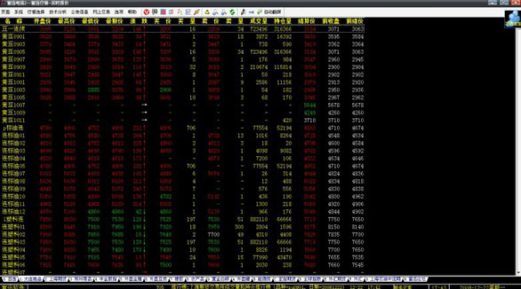 进入系统后您首先会看到实时报价页面,此页面为系统缺省显示页面,其分为选择条和主页面两部分,选择条用于切换不同期货(或商品)交易所以及外盘金属、外盘豆类等,您可以单击其中的选项卡来选择;主页面用于显示您在选择条上选择的指定交易所的详细行情报价,如下图: