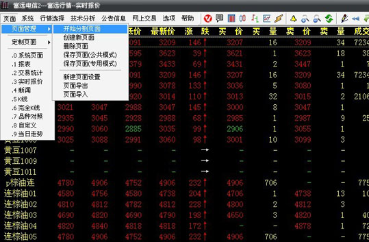 富远行情分析系统提供了页面设置与修改功能,用户可以在页面中定义自己喜好的内容组合,下面以实例介绍,在页面菜单的页面管理项目中点击创建新页面后弹出新建页面窗口,在页面名字框中输入页面名,如以我的页面命名,点ok进入页面编辑状态窗口,在此窗口中点右键弹出操作菜单,然后点击左右分割,此时窗口会分为左右两个部分,在左边窗口中再点右键菜单上下分割,此时左边窗口会分为上下两部分,在左上的窗口中点右键菜单插入模块-单个图形-k线图,此时窗口中会填充为k线图,在左下窗口中点右键菜单插入模块-单个图形-当日走势,此时此窗口中会填充为分时走势图,在右边窗口中点右键菜单插入模块-交易统计,此时窗口中会填充为交易量能堆积图,至此完成模块插入操作,点右键菜单保存弹出完成提示,点ok确认,然后退出并重新登陆富远行情分析系统,此时在页面菜单中即可直接选用您所定义的我的页面了,如下列图示: