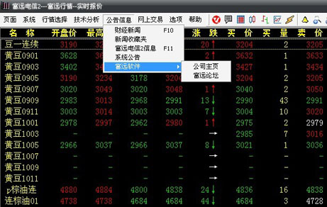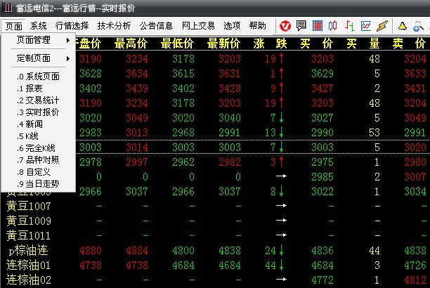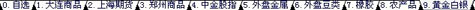 行情选择菜单的功能与实时报价页面中的选择条功能相同,系统在其中按地域及品种分类设定了17个常用板块,分别为0.自选、 1.大连商品 、2.上海期货、 3.郑州商品、 4.中金股指、 5.外盘金属、 6.外盘豆类、7.橡胶、8.农产品 、9.黄金白银、A.外盘糖、B.能源类、C.亚指期货、D.全球指数、E.外汇期货、F.外汇、G.上海石油中远期、H.富远论坛,您可以方便的点选您要查看的板块,如下图: