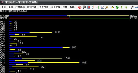 (3)交易统计:页面用于显示当日每个成交价位上的累计成交量中开仓平仓量及买卖量的对比情况,如下图: