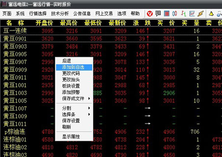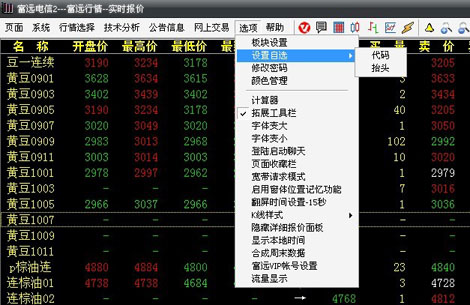 (4)实时报价:页面用于显示不同板块中商品合约的实时报价列表,点击右键可弹出操作菜单;