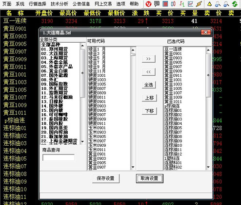 C.“更改代码及更改抬头”选项功能:本功能用于选择或调整品种代码及抬头组合,首先切换到您需要更改代码的页面,点击调整代码抬头弹出选择代码窗口,在弹出的代码选择窗口中您可以看到“已选代码”列表中列出了您当前已选择的代码,在“可用代码”列表中列出了系统中所有可选用代码,您可以在“可用代码”列中选择您所需要的代码,选择代码后单击向右双箭头“》”按键,您会看见您所选的代码出现在“已选代码”列表中,单击“保存设置”后再关闭窗口,更改抬头组合的操作与此类同,如下图:
