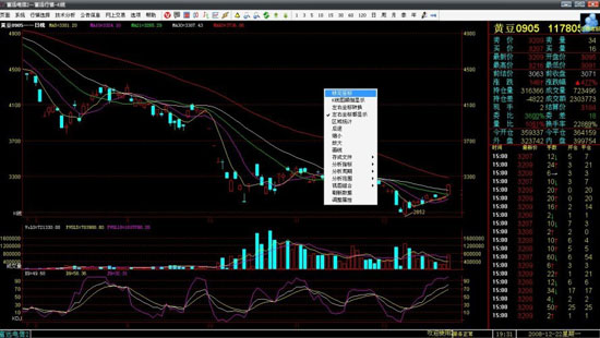 (2)报表 :页面用于显示某一品种各周期下详细的价格,成交量及持仓量数据列表,点击右键可弹出选择菜单,如下图: