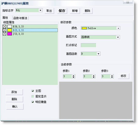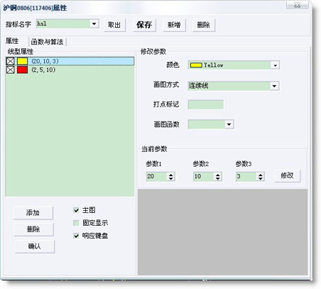 G.调整属性:点击调整属性选项弹出指标修改窗口,以叠加 boll 指标为例,先点两次添加,此时线型属性框中会出现两个 emabase 指标,分别点选两个 emabase 指标然后在右边画图函数选择栏中选择 bollup 和 bolldn 替换 emabase,再在当前参数框的参数 1里输入 6,参数 2 里输入 12,点击修改将 bollup 和 bolldn的参数设定好,最后点击确认完成设置,这时会在主图形成叠加的效果,如下图: