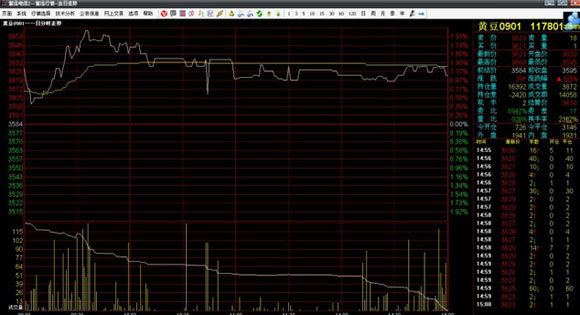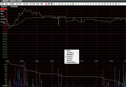 (10)当日走势页面用于显示各品种的当日分时走势图,点击右键功能菜单可调出该品种的历史分时走势图,在成交量图中点右键可显示多空对比图,其中黄色表示成交量,如下图