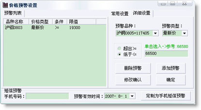 添加预警功能被点选后会弹出价格预警设置窗口,您可以在此窗口中的代码栏输入要预警品种的代码,在价格范围栏中选择好条件后输入具体数值,然后点击添加预警则可,要修改或删除预警项目,可先在右边列表中选定,然后点击修改或删除预警即可,如下图: