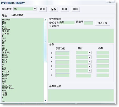 富远行情分析系统1.9版提供了技术指标编制功能,您可以由此功能定义和修改自己的特色指标,下面举例介绍,先切换到 k 线页面点右键弹出功能菜单,点选调整属性弹出指标属性窗口,点击函数与算法卡片,这时在左边会显示公式列表栏,右边会显示公式与算法栏,下面我们编制一个换手率指标 HSL,在公式名称框中输入HSL,在函数号框中输入 159,函数号是公式的编号,其与右边公式列表中的公式一一对应,在公式描述栏中填写公式的用法与说明,在函数表达式栏中填写公式的算法 x/y*100,此例用到 x 和 y 两个参数,在参数功能框中输入 0,在 x 的类型中选成交量,y 的类型选持仓量,在参数框中都输 0,完成后点击保存公式,此时在左边公式列表中会多出一个 hsl,如下图: