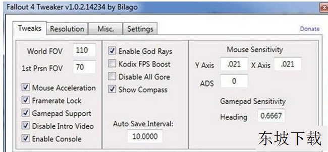 玩家可以通过修改.ini文件来调节视野,不过有了这个工具,不仅调节视野更为方便,还可以实现诸如锁定FPS,鼠标灵敏度,甚至还可以调节哔哔小子的颜色(当然了,游戏设置里面也可以调节)等等功能。