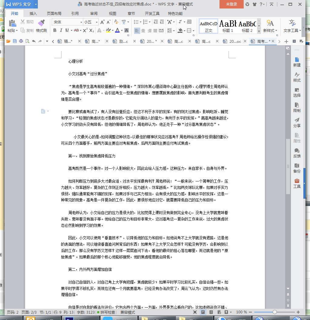 要比赛或者考试了,有人没有丝毫反应,但这不利于水平的发挥,有的则太过焦虑,影响吃饭、睡觉和学习。“轻微的焦虑状态才是最好的,它能充分调动人的潜力,有利于水平的发挥。”离高考越来越近,小文学习的劲头没有降低,但他的情绪降低了,周老师认为,他正处于一种“过分高考焦虑状态”。