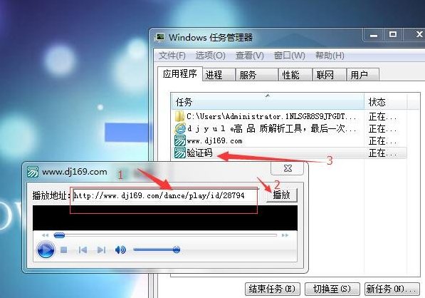 1、打开网站dj169网站,然后打开工具,复制试听链接,再打开你电脑里的任务管理器, 会看到在工具的进程名字的下面还有一个东西,名字是验证码