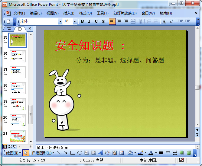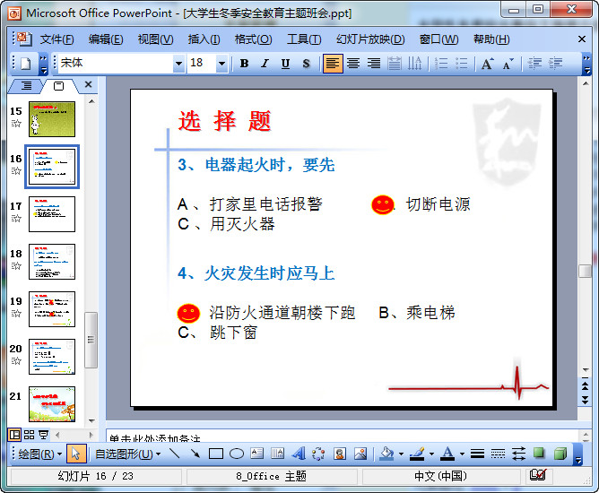 大学生冬季安全教育主题班会课件,总共有23页,是一份关于冬季大学生防火防盗的安全知识教育课件。十分的精美,从以前的例子来开题,然后再就是相关的注意事项。欢迎有需要的朋友前来东坡下载使用。