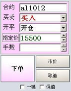 按输入项依次输入后,点击“下单”发出委托单,点击“市价”,以市价发出委托单,点击“取消”清空输入项。下单栏支持全快捷键操作,符合大多数习惯使用键盘下单投资者的使用习惯,“买卖”、“开平”快捷键支持自定义配置。
