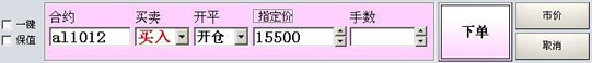 下单栏的各输入信息可手工输入,也可以通过双击行情信息自动带入,通过设置委托参数,还可以双击持仓信息自动带入。