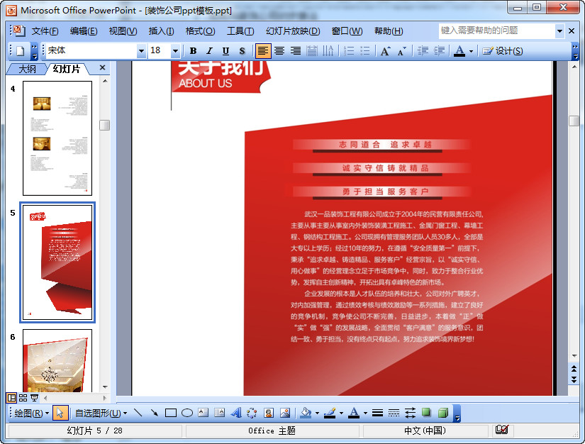对于很多装修公司来说,自己家的ppt一定要有特色,不是精美奢华的,就应该是温馨家园式或者低调内涵等等风格的,非常的多,根据自己公司的定位不一样,选择不同的ppt模板。今天东坡小编就为大家带来一份大气的装饰公司ppt模板,希望大家喜欢。