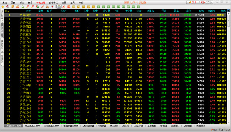 南华期货博易大师POBO上期客户端(CTP版)是一款可以支持夜盘博易大师POBO上期CTP版客户端,支持24小时全球品种看盘需求,还支持国内期货、LME、CBOT、COMEX、TOCOM、NYCE、NYME、美汇、全球主要指数、期货评论、 农产品信息、金属市场信息及财经信息,以判断市场趋势并跟随趋势的周期性变化来进行股票及一切金融衍生物交易决策的方法的总和。