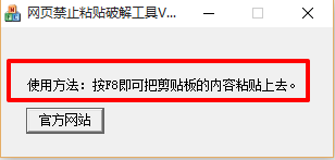 有一些网页特别奇葩,想发布一些内容不让粘贴,必须一个字一个字的输入才行,本来我事先编辑了一篇超级文章结果不让粘贴,难道我要再重新输入一遍吗,浪费时间、浪费精力、浪费脑细胞,哪个编辑想出来的,专门阻止我发布文章吗!幸好我是程序员,我决定改变现状,开发一个专门破解网页禁止粘贴的软件解决这个问题,所以这个软件就诞生了。网页禁止粘贴破解工具是我花了一整天时间才开发完的,主要是希望把大家解决网页不能粘贴的烦恼。软件使用非常简单,在需要输入文章的网页上按F8就会把复制的内容粘贴到网页上,超级高效的说!