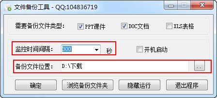 2、选择监控时间间隔,每隔多长时间就会自动扫描系统上新增的指定格式文件并备份,然后选择备份文件到哪个位置即可开始备份。