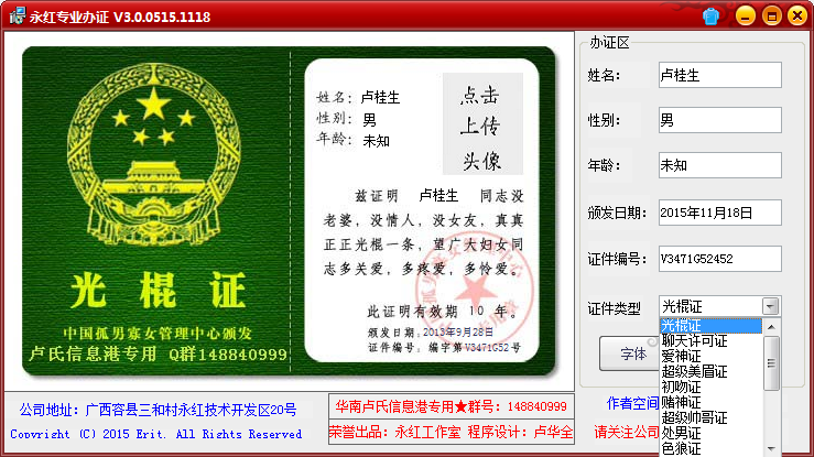 永红专业办证是一款专门用于生成各种另类搞笑证件的网络搞笑证件制作器。无需安装,绿色免费,能生成各种清晰无水印的各种搞笑证书,信息随你填写,一键生成jpeg图片格式,轻松分享到各大论坛或贴吧等。
