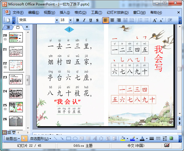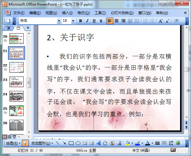 一年级家长会一切为了孩子ppt课件,总共有45页,主要是讲述孩子刚刚从幼儿园进入小学学习,要注意的地方,培养的习惯。首先就是介绍了一下学校,然后就是让孩子生活、学习习惯的培养,再就是语文学科的建议以及和家长共同努力。欢迎有需要的朋友前来东坡下载使用。