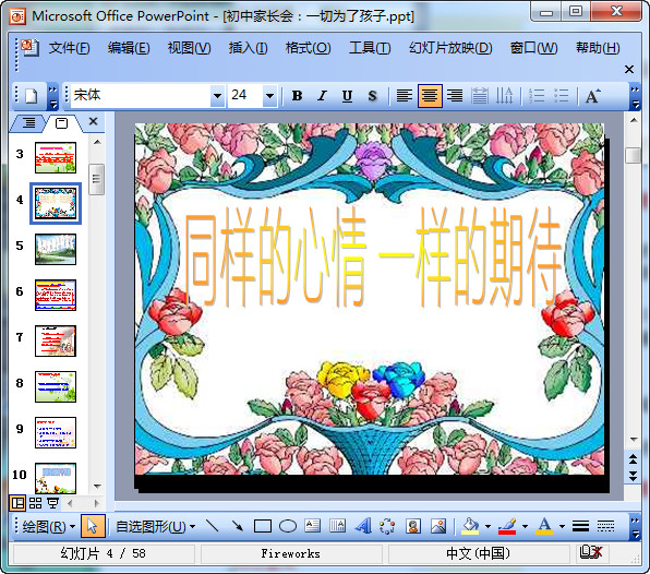七年级下学期家长会课件,总共有58页,它的主题是一切为了孩子,做好孩子的护航使者。其实就是老师和家长共同努力,为孩子创造一个美好的未来。先是学生、家长代表发言,汇报班级的情况,与任课老师面对面,给家长的建议,大家互相努力等内容。