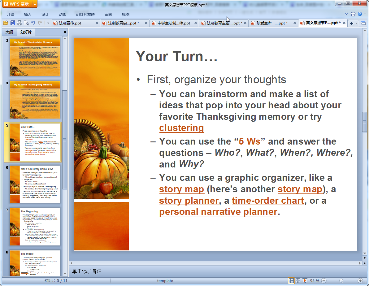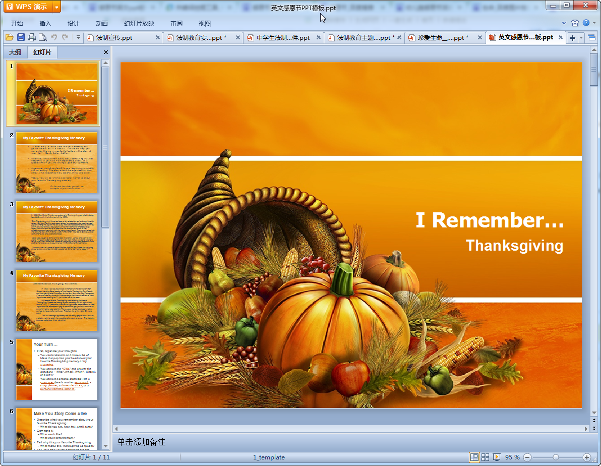马上就要要感恩节了,这里提供给大家一篇最新的感恩节英文ppt模板,该模板共有11页制作十分精美给人眼前一亮的感觉,有需要该模板的朋友们可以来我们东坡免费的下载使用!