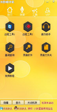 工具:远程工具 录音软件 音效助手(1自带100多个音效 支持自定义音效 支持快捷键 支持多通道技术) 基调查询(全新的基调查询系统支持市面上基本所有的歌曲)