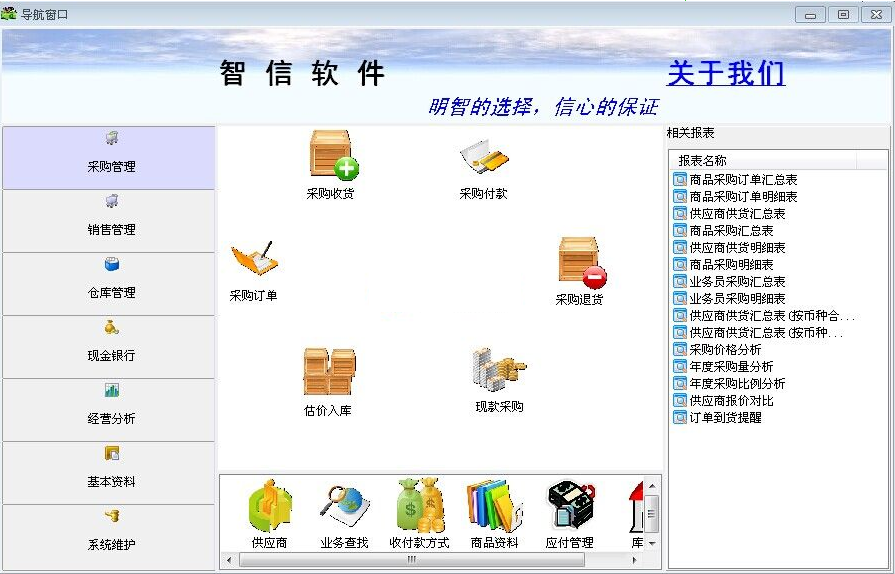 智信服装进销存管理软件是智信进销存软件系列的服装类版本,具有服装行业特殊的行业管理模式,特 别适合服装类企业业务管理,销售管理,财务管理,货品管理等方面的应用,主要分为客户管理,供应 商管理,采购管理,销售管理,财务管理,仓库管理等模块。