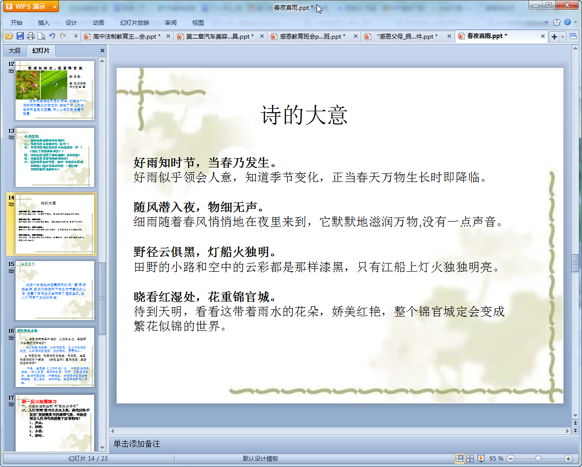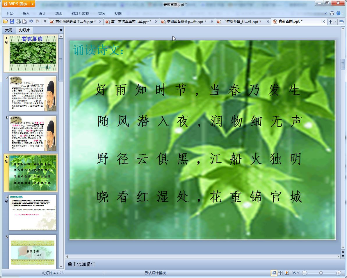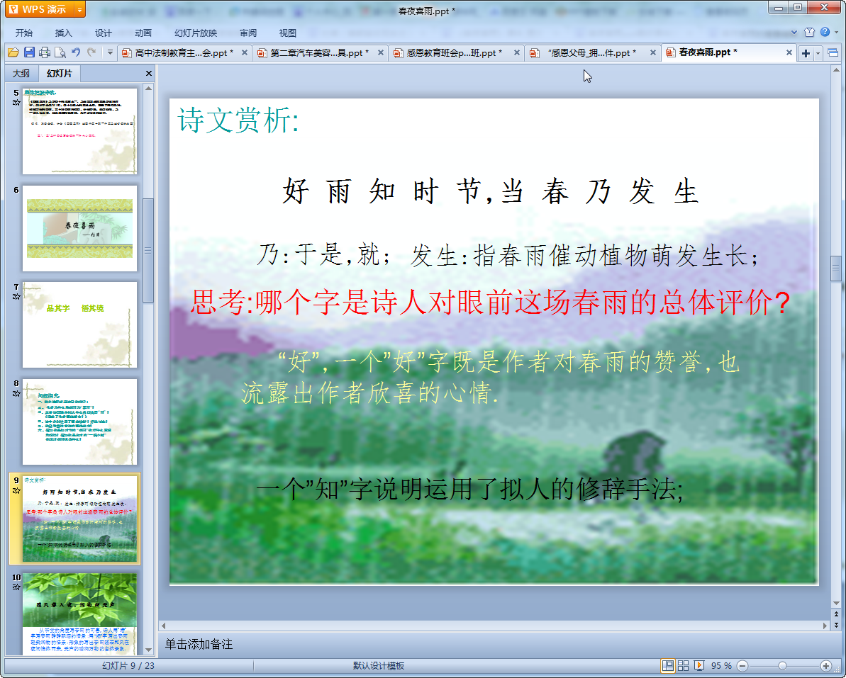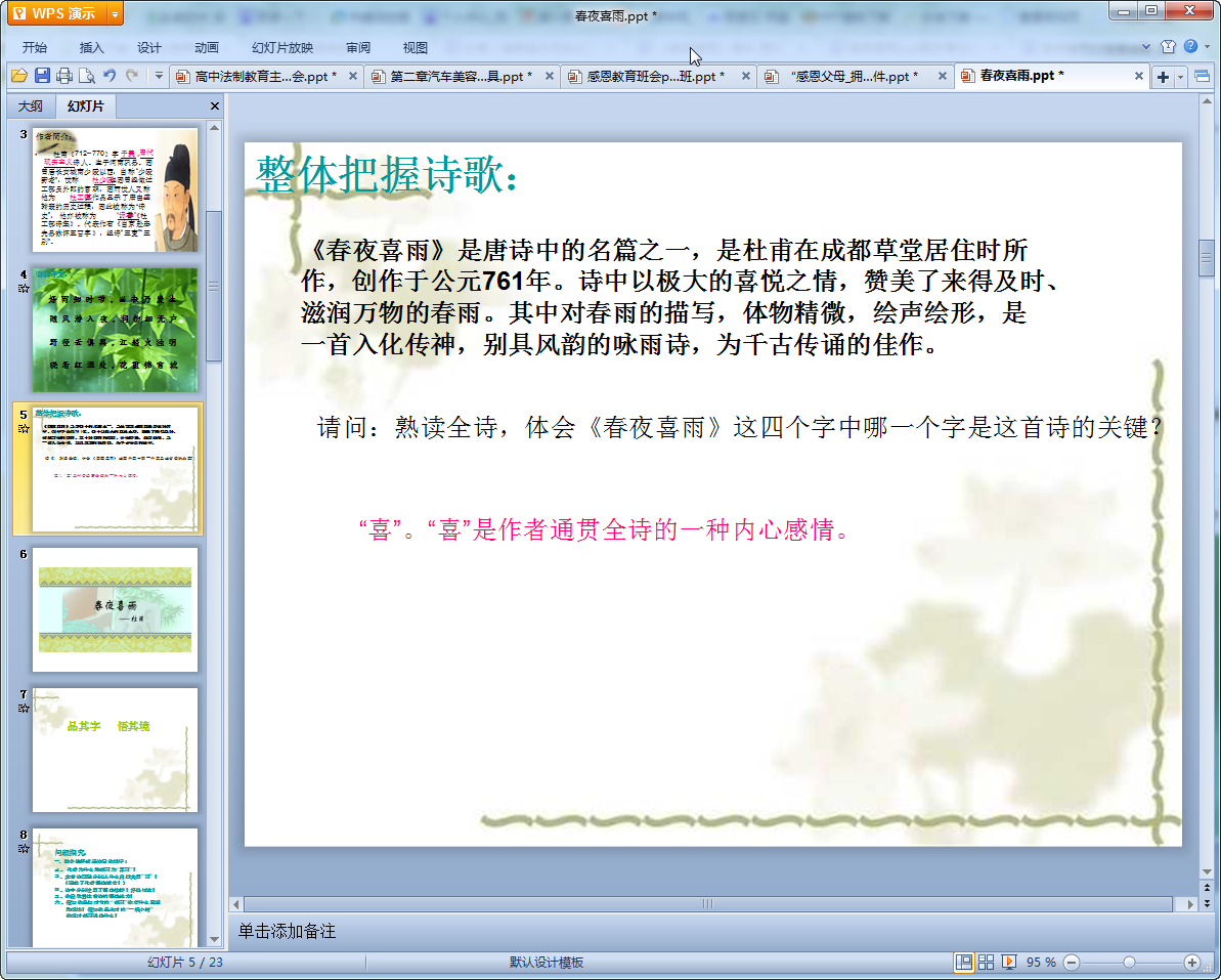 杜甫是唐朝有名的诗人大家对此一定不会陌生,春夜喜雨则是他的作品之一,这里带来的是春夜喜雨教学课件,共有23页内容制作比较精美,有需要的老师都可以来免费下载使用,想提前预习课文的同学家长也可以来看看!