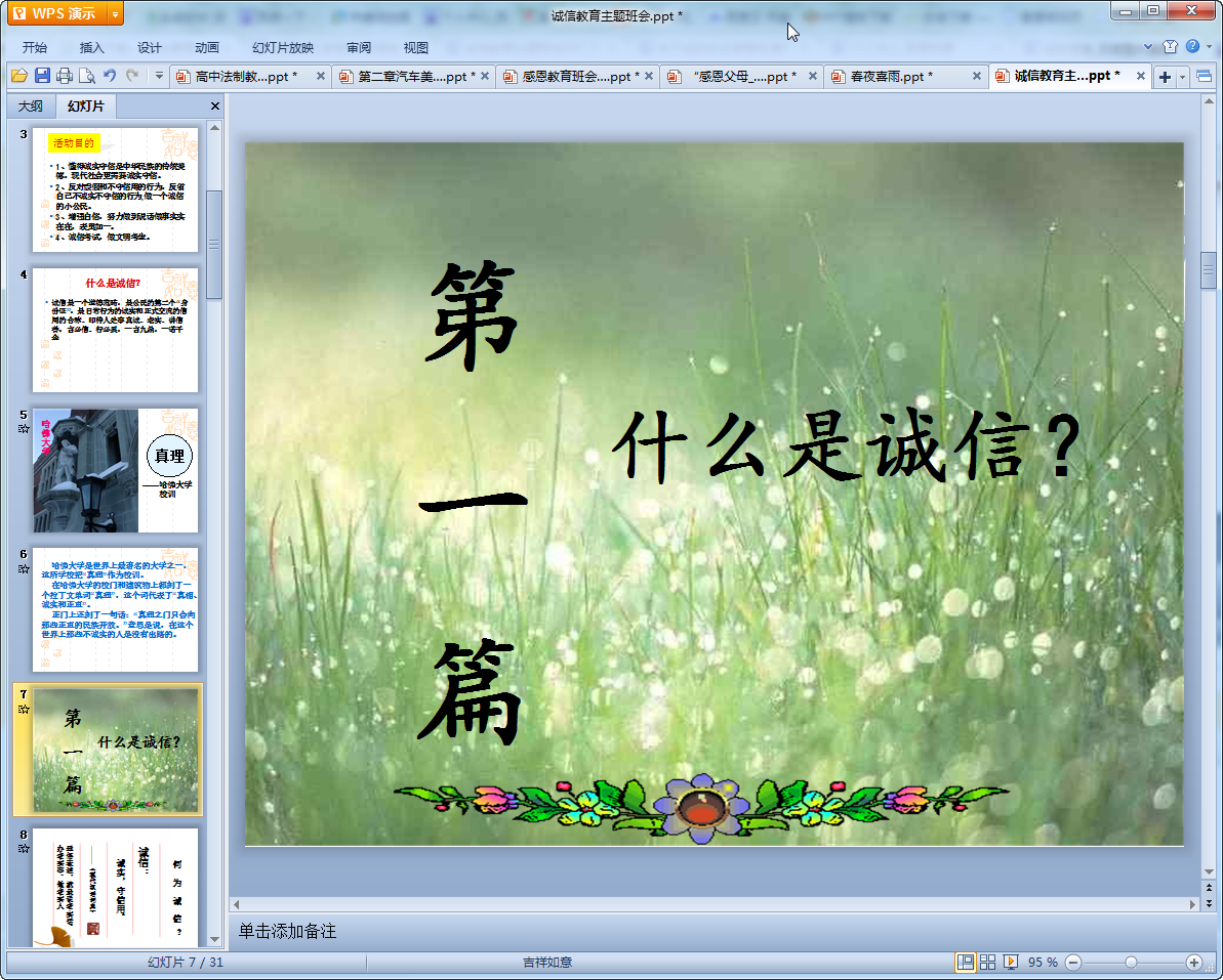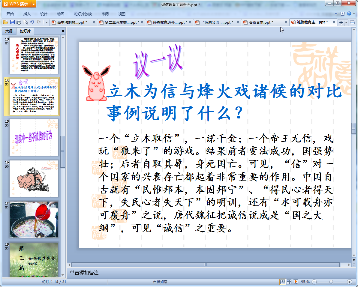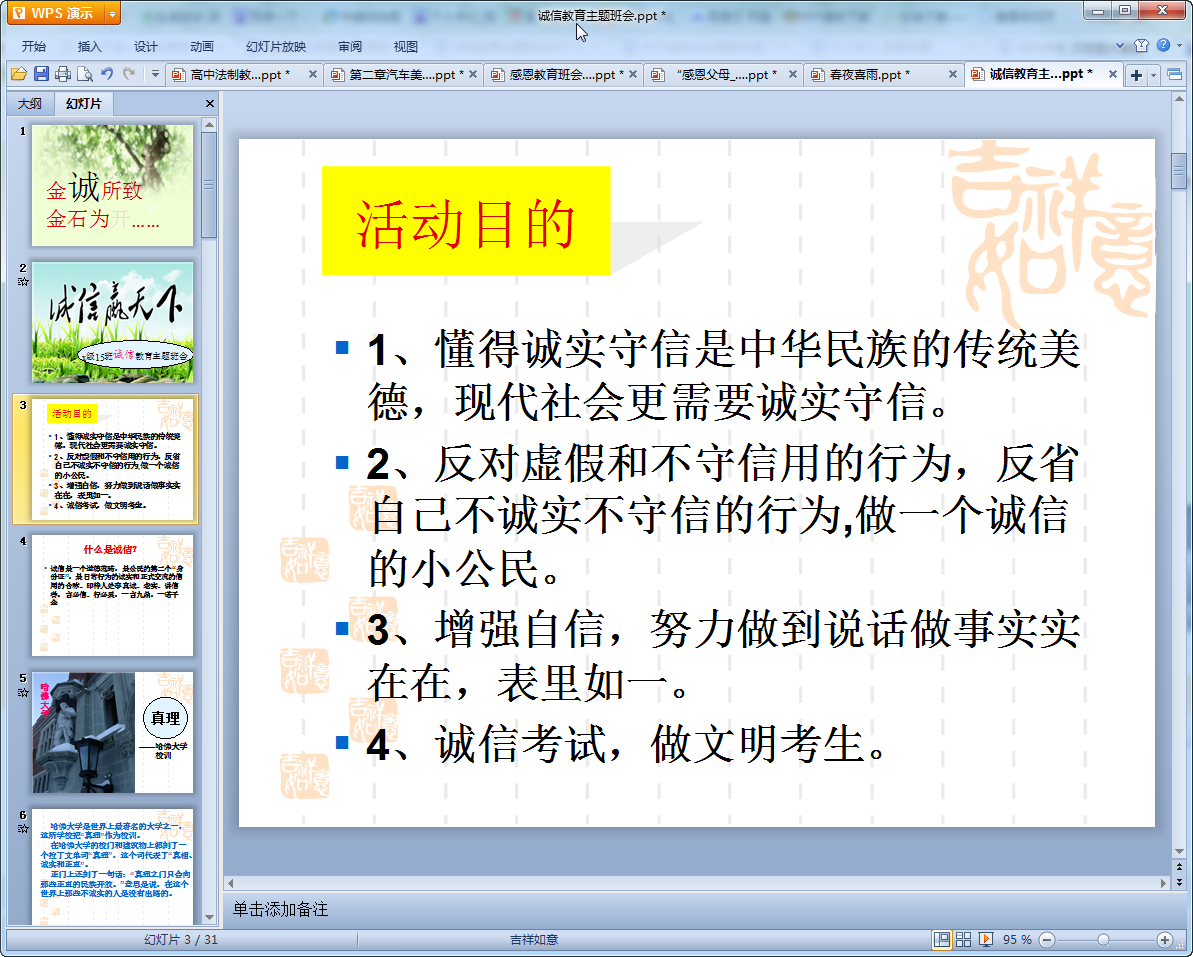 这是东坡免费提供给大家的以诚信为主题的主题班会课件,内容制作精美共有31页,取材内容十分精细十分具有教育意义的一篇课件,有需要该方面课件的老师们可以来我们这边看看,为大家免费的提供这篇诚信教育主题班会ppt课件!