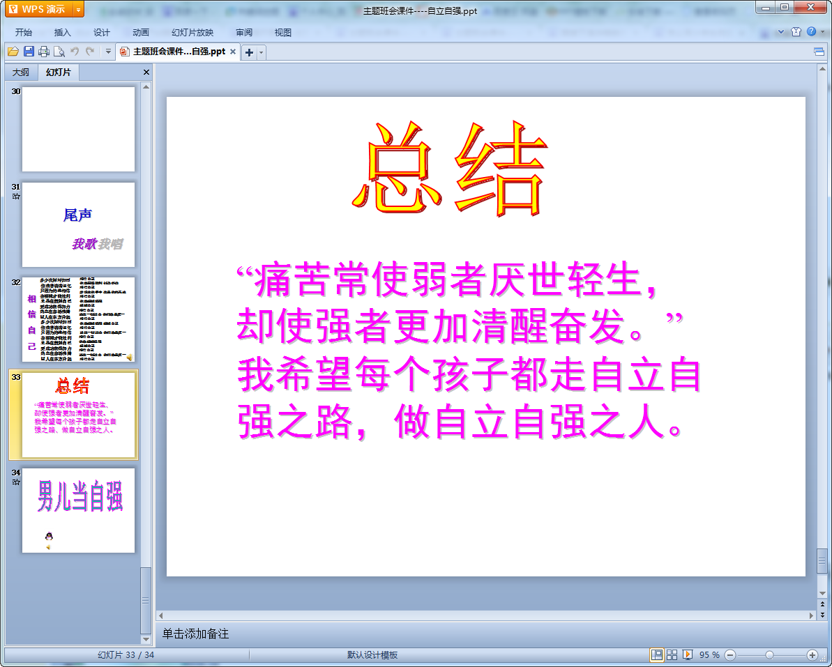 “痛苦常使弱者厌世轻生,却使强者更加清醒奋发。”我希望每个孩子都走自立自强之路,做自立自强之人。