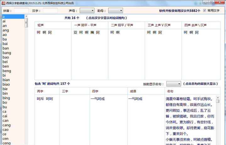 西择汉字韵律查询软件,完整再现7564个汉字韵律软件正式发布,通过拼音找到所需的汉字,也可以通过输入汉字来找到汉字的拼音,在汉字显示框里有对应的汉字,每个汉字后面显示出声调,“0”为平声,“1”为一声、“2”为二声、“3”为三声、“4”为四声。通过单击汉字最示对应词组句,词组分为“二字词”、“三字词”、“成语”、“名句”。可以通过23个声母来查找汉字。22个韵母来查找汉字,还可以结合声调来查找汉字。又添加了读音,方便同学们查找到汉字的相关内容。