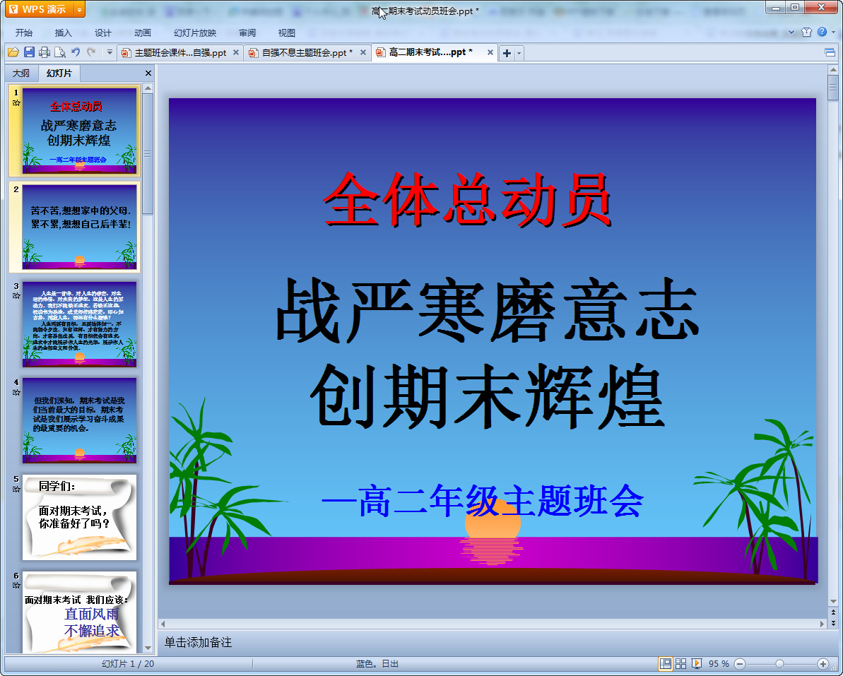 期中考试已经过去了,同学们也不能放松自己应该主动的去准备备战期末,这里我们东坡下载给大家带来这篇高二期末考试动员主题班会课件,课件共有20页内容制作精美,对提升学生们的学习气氛学习热情很有帮助,有兴趣的老师可以来看看,是时候开展一个期末考试动员班会了!