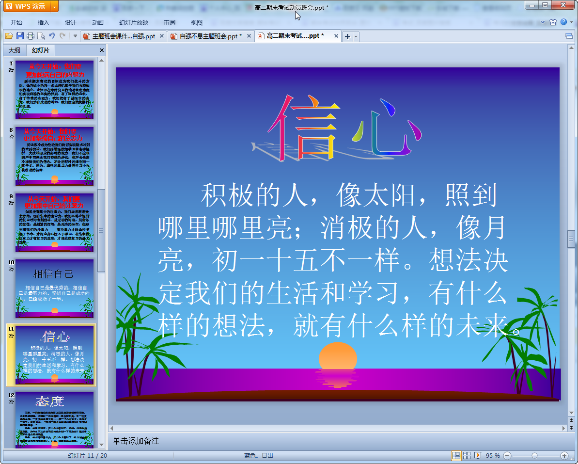 积极的人,像太阳,照到哪里哪里亮;消极的人,像月亮,初一十五不一样。想法决定我们的生活和学习,有什么样的想法,就有什么样的未来。