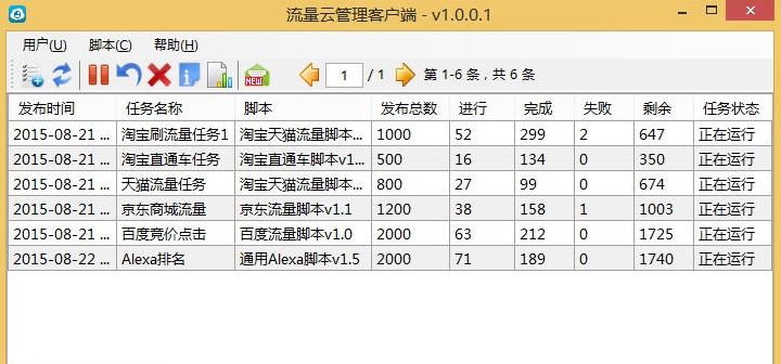 流量云使用的是自创的脚本模式,只需简单设置,便可满足各种流量需求。用户可以使用不同的脚本模板发布不同的任务,每个脚本的功能、模式都不一样。目前已经添加有“淘宝天猫关键词流量脚本”、“京东关键词流量脚本”、“通用流量脚本”等脚本模板,满足不同用户不同的流量需求,更多脚本正在编写中。如果您有特殊的流量需求也可以联系我们进行脚本定制开发。