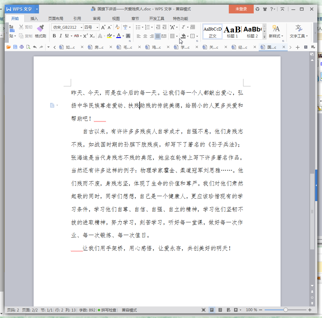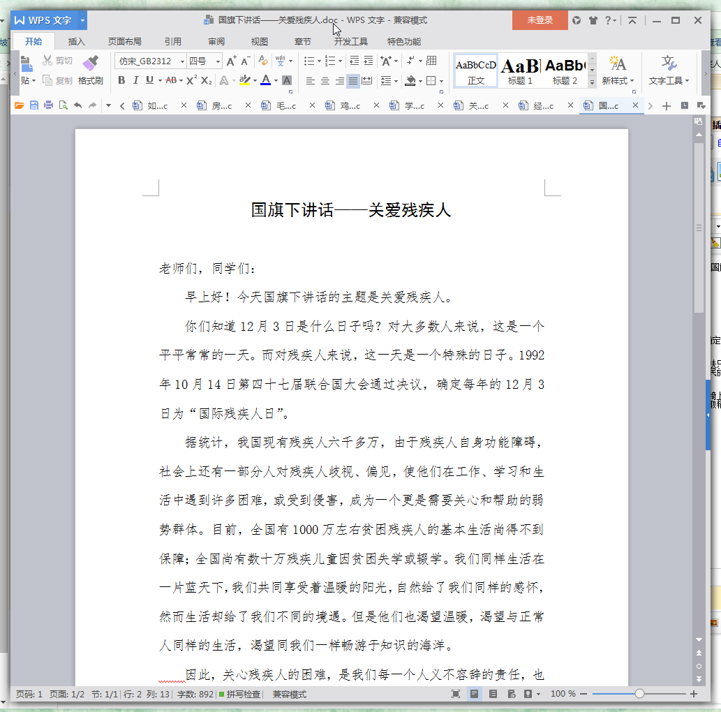 早上好!今天国旗下讲话的主题是关爱残疾人。