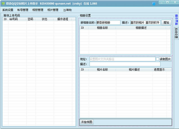 群森QQ空间相片上传助手可以批量将自己设置好的相片传到空间新建相册,自定义相册名称相册描述,相片描述,帮助你快速的上传相片哦,有需要的赶紧来下载使用吧。