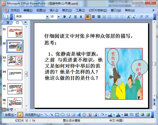 不知道大家听说过范进中举这件事情没有呢。今天东坡小编为各位朋友们带来的就是一份人教版八年级语文的范进中举ppt公开课课件,总共有54页,首先就用图画对文中经典的范进中举前、后进行了对比,非常的深刻。对文章的中心进行了有针对性地提问,解释。非常的优秀,欢迎前来东坡下载使用。