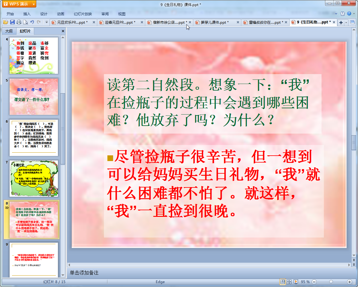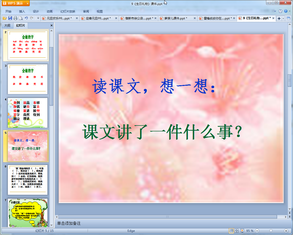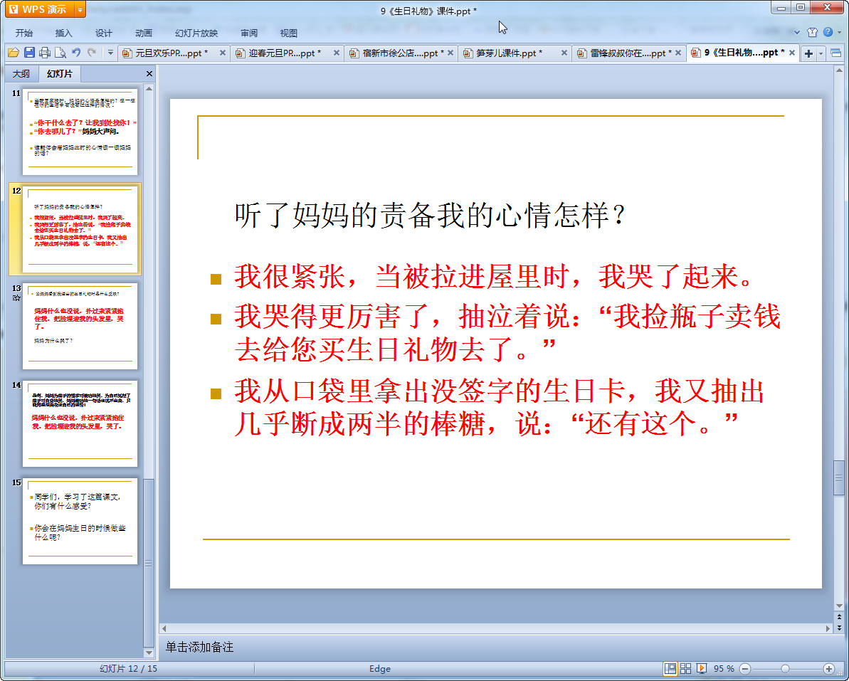 这是我们东坡下载给广大老师准备的生日礼物教学课件,课件共有15页课文中的重难点归纳的十分清楚,该课文具有一定的教育意义,教会学生会体谅父母,正在寻找该课文课件的老师们快来免费下载吧!