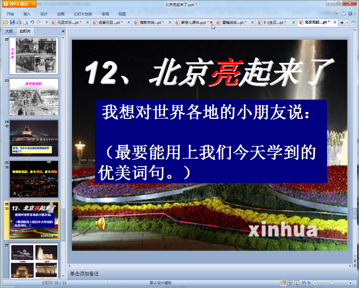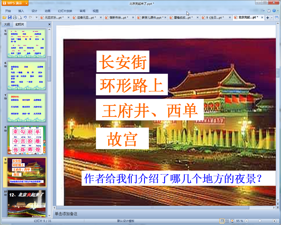 这是一篇小学语文课文北京亮起来了教学课件,课件共有31页内容制作十分丰富,精美的图片让学生们能更快的理解课文,对ppt教学感兴趣的老师可以快来下载这篇北京亮起来了教学课件吧!