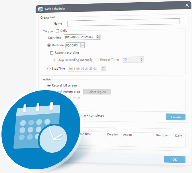 此屏幕录制软件另一特色功能就是仅需设置好起止时间或定制时长就可以创建计划任务。即便您不在电脑前,也可以自动录制视频。
