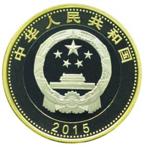 中国航天普通纪念币正面主景图案为国徽图案,其上方刊“中华人民共和国”国名,下方刊年号“2015”。