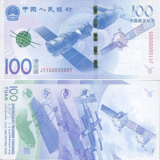 正面主景图案为神舟九号飞船与天宫一号交会对接图案。左上方为国徽图案、“中国人民银行”行名,其下方为东方红一号卫星图案。票面左下方为面额数字“100”和汉字“壹佰圆”。主景图案右侧为嫦娥一号卫星图案,其上方为面额数字“100”和“中国航天纪念”字样。