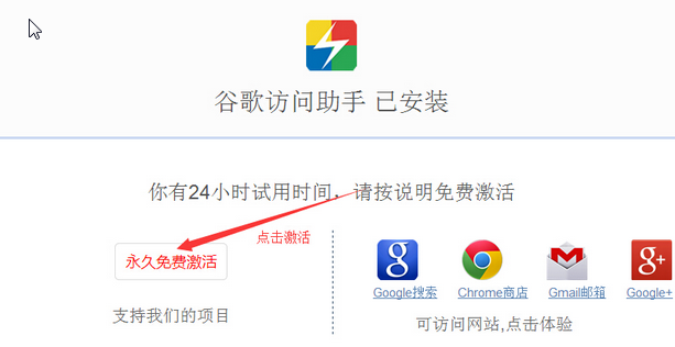 3、安装谷歌访问助手后,会出现提示永久激活页面,如果你想长期使用谷歌访问助手请点击激活。