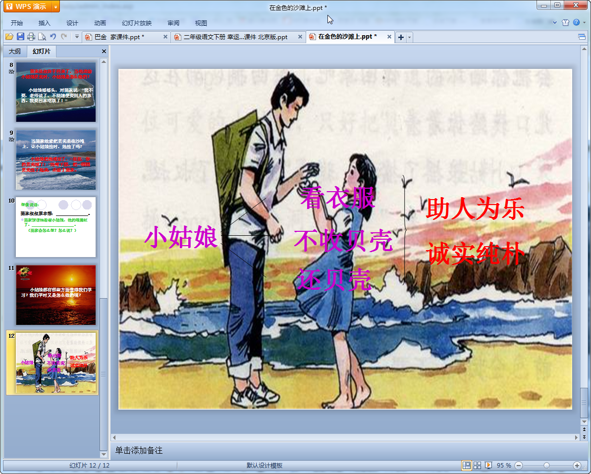 这是一篇小学课文中的在金色的沙滩上教学课件,课件共有12页内容丰富制作精美,深受学生们的喜欢,将小女孩助人为乐诚实纯朴良好品质传输给大家,有需要该课件的老师们不要错过了,来我们东坡免费的下载使用吧!