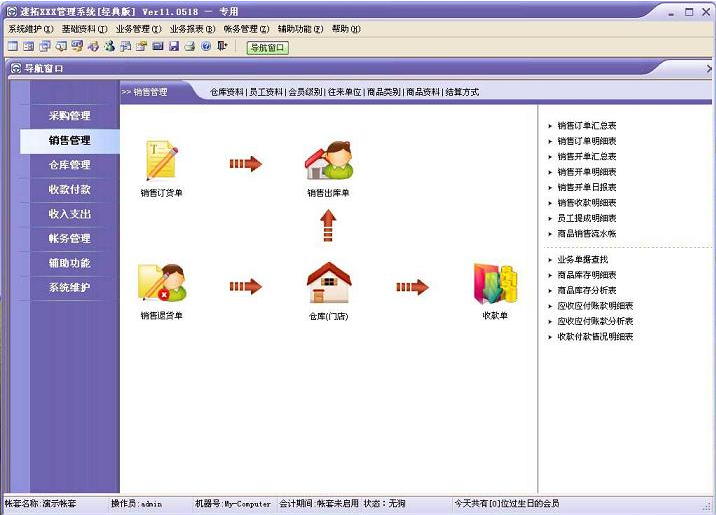 一、基本功能:智能订货、进货入库、进货退回、销售出库、销售退货、报损、报溢、调入、调出、拆零、组装、盘点、借出、借入、收款、付款、预收、预付、收入、支出、成本、利润及财务会计核算等。