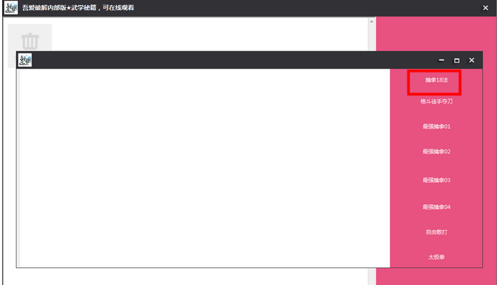 不少人对中国的传统武学很感兴趣,可惜就是找不到适合的资源,现在小编就直接给你们带来了吾爱破解武学秘籍资源获取工具,里面包括太极拳、散打、柔道等一类的资源,让你们在闲暇的适合进行下载观看!