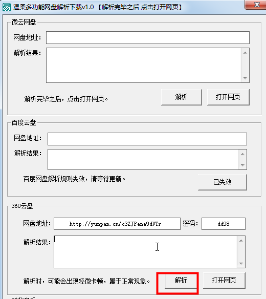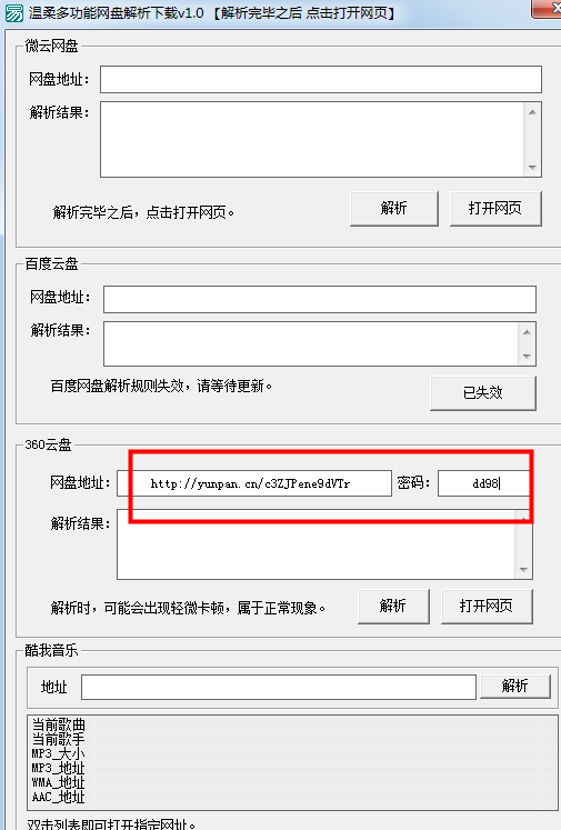 现在单一的网盘地址解析已经不能够满足大家了,小编给你们推荐的是加强版的温柔多功能网盘解析下载器。这个里面包括了微云网盘、360网盘,而且还拥有酷我音乐的解析能力!