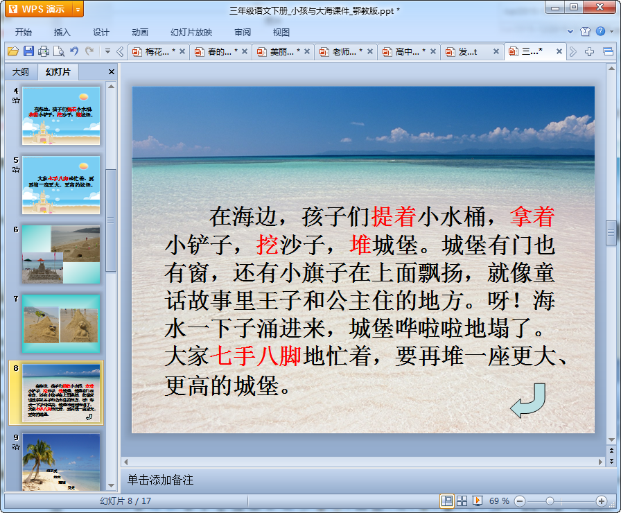大家七手八脚地忙着,要再堆一座更大、更高的城堡。