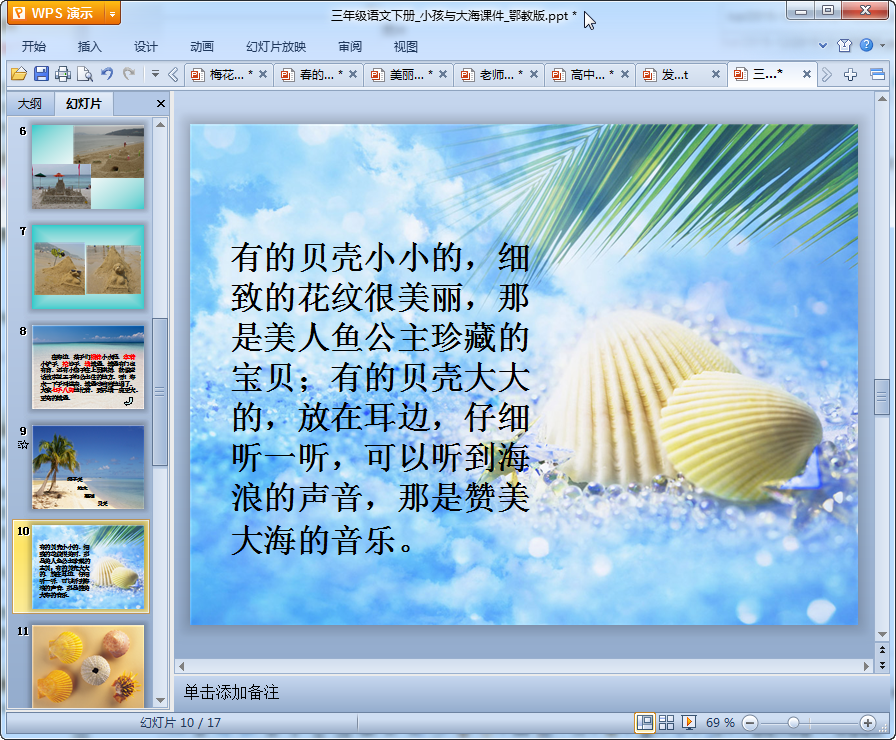 有的贝壳小小的,细致的花纹很美丽,那是美人鱼公主珍藏的宝贝;有的贝壳大大的,放在耳边,仔细听一听,可以听到海浪的声音,那是赞美大海的音乐。